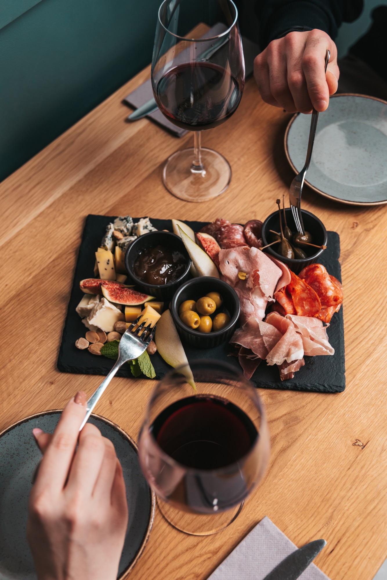 Nasza selekcja serów i wedlin: chorizo, prosciutto crudo, mortadela z pistacjami, francuska kiełbasa podsuszana z orzechami, 2 rodzaje twardego dojrzewającego sera polskiego Bursztyn, francuski Camembert Benoit, francuski ser pleśniowy niebieski Bleu d'auvergne, oliwki Manzanilla z abchois, owoce kaparów, konfitura figowa. pieczywo