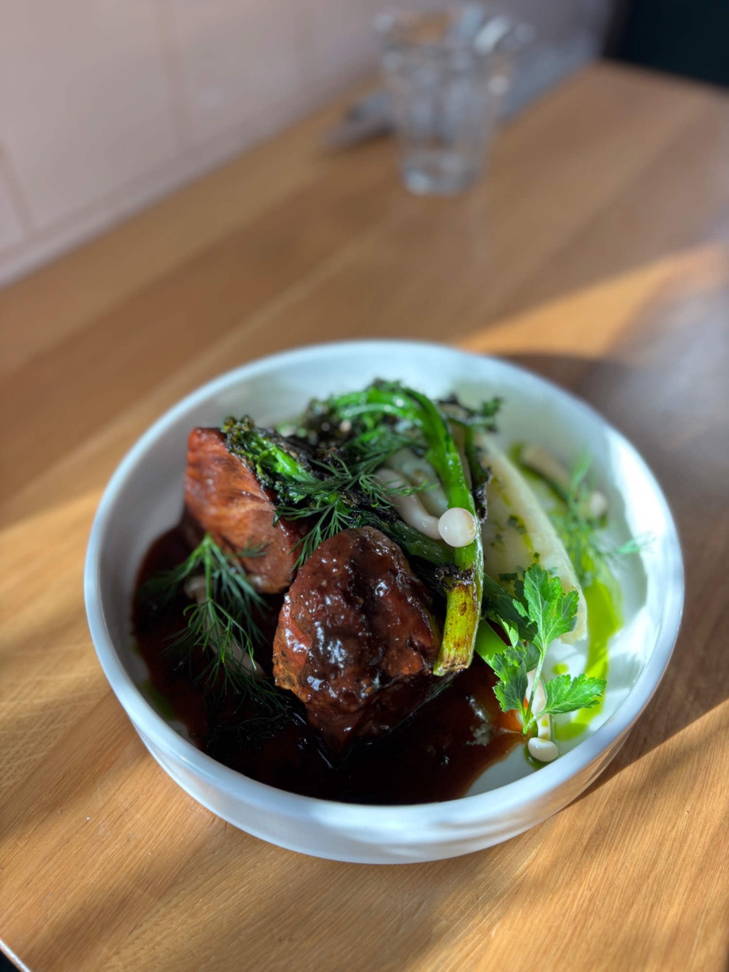 Beef cheeks with potato puree, broccolini, and pickled shimeji mushrooms