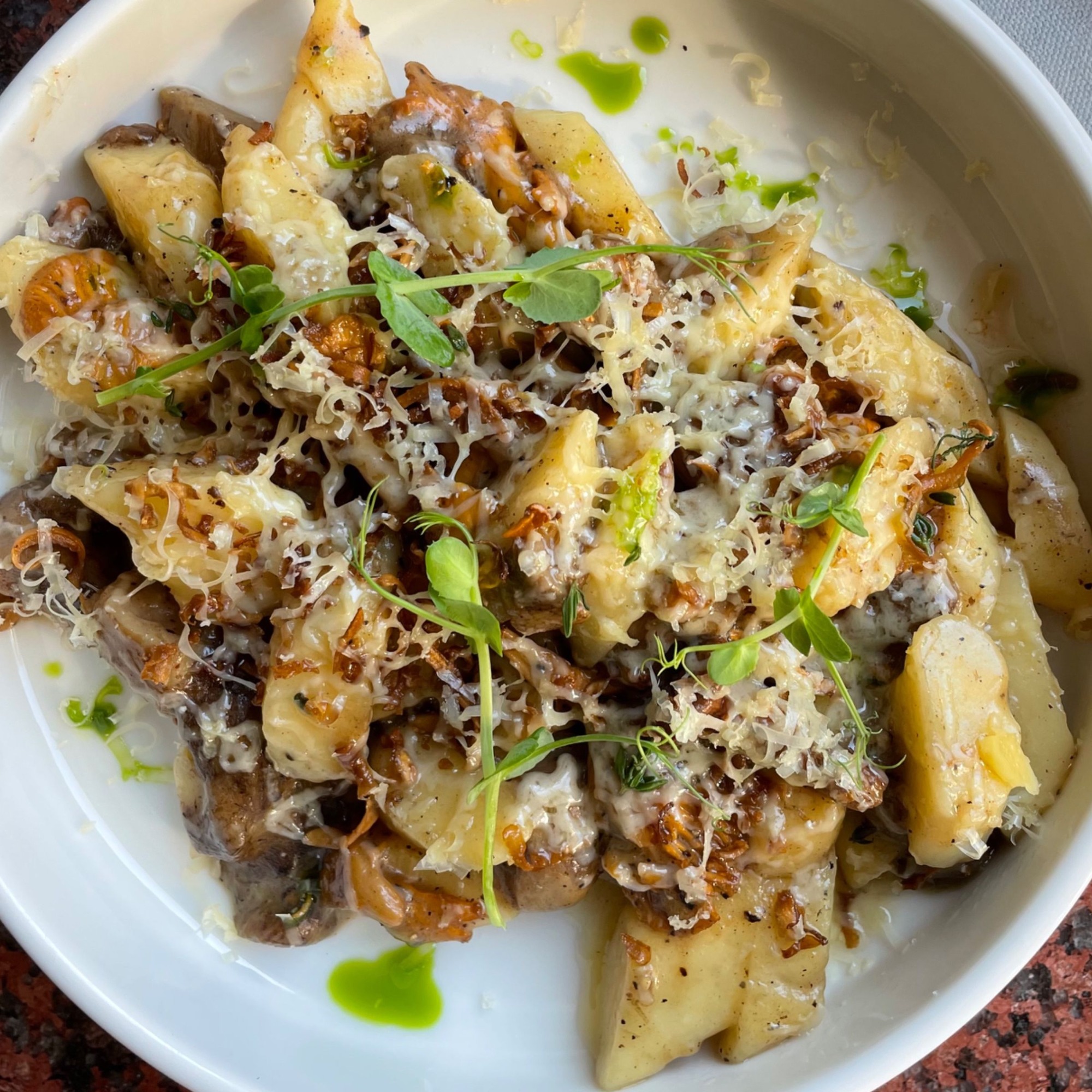 Zabielana śmietanką zupa grzybowa przygotowana na grzybach leśnych, grzybach shitake, z olejem truflowym -